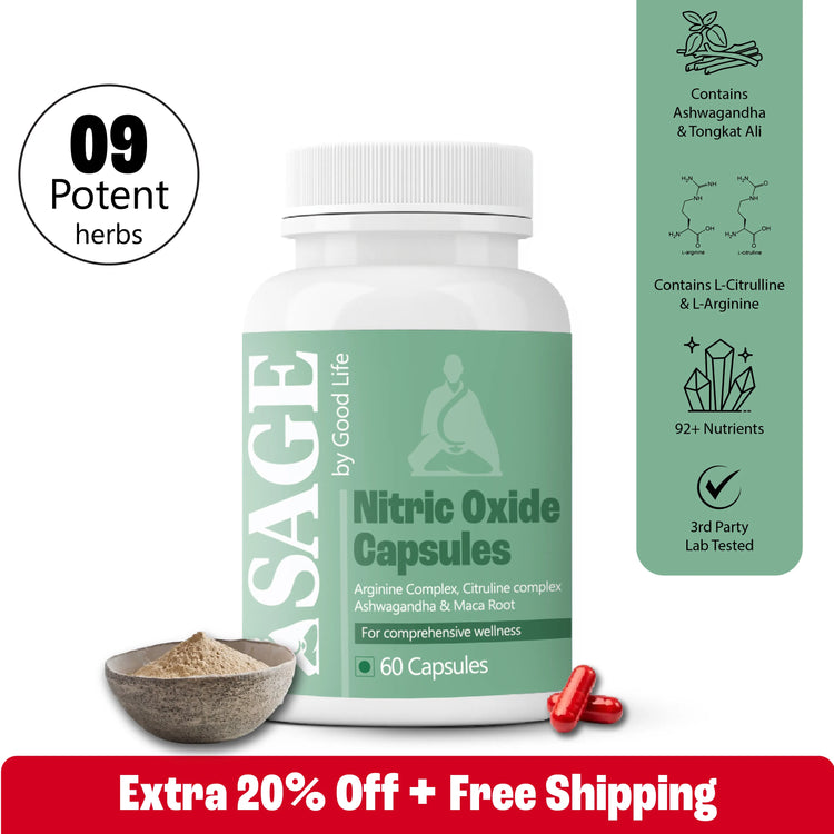 Sage by Good Life Nitric Oxide Capsules are your best friend for optimal performance, whether you're looking to increase your stamina, support cardiovascular health, or recover more quickly after intense activity. Each serving contains potent ingredients like L-Arginine, L-Citrulline, and Ashwagandha that work in concert to improve workout performance, support muscle repair, and fight fatigue.