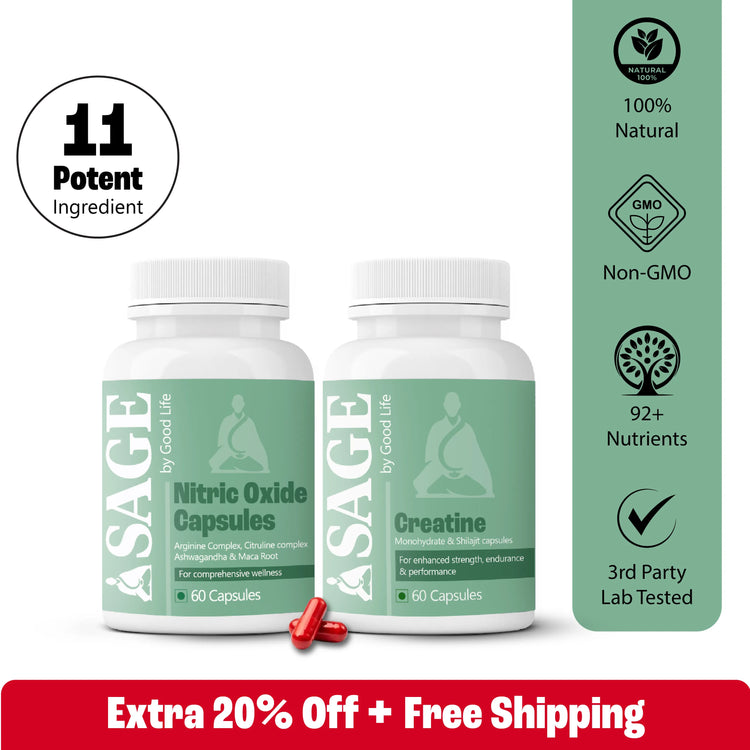 Unleash your inner strength with the Sage by Good Life Power Performance Stack — a dual-force combination of Nitric Oxide and Creatine capsules designed for athletes and fitness enthusiasts who demand more from every workout. This high-performance pairing optimizes blood flow, muscle volume, and endurance, helping you push beyond limits and achieve peak performance.